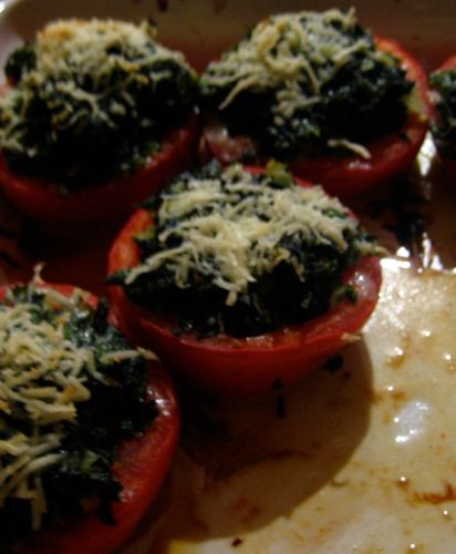 Preheat oven to 425ºF. Melt butter in heavy saucepan. Add the onions and cook until translucent, about 10 minutes. Add the flour and nutmeg and cook, stirring, for 2 more minutes. Add the cream and cook until thickened. Squeeze as much liquid as possible from the spinach and add the spinach to the sauce. Add Parmesan cheese and season to taste. Using a melon-baller, hollow out some of each tomato to create room for spinach stuffing. Fill tomatoes and top with grated gruyère cheese. Bake for about 30 minutes or until heated through and lightly brown on top. Tomatoes can be filled, covered and refrigerated the day before serving.
