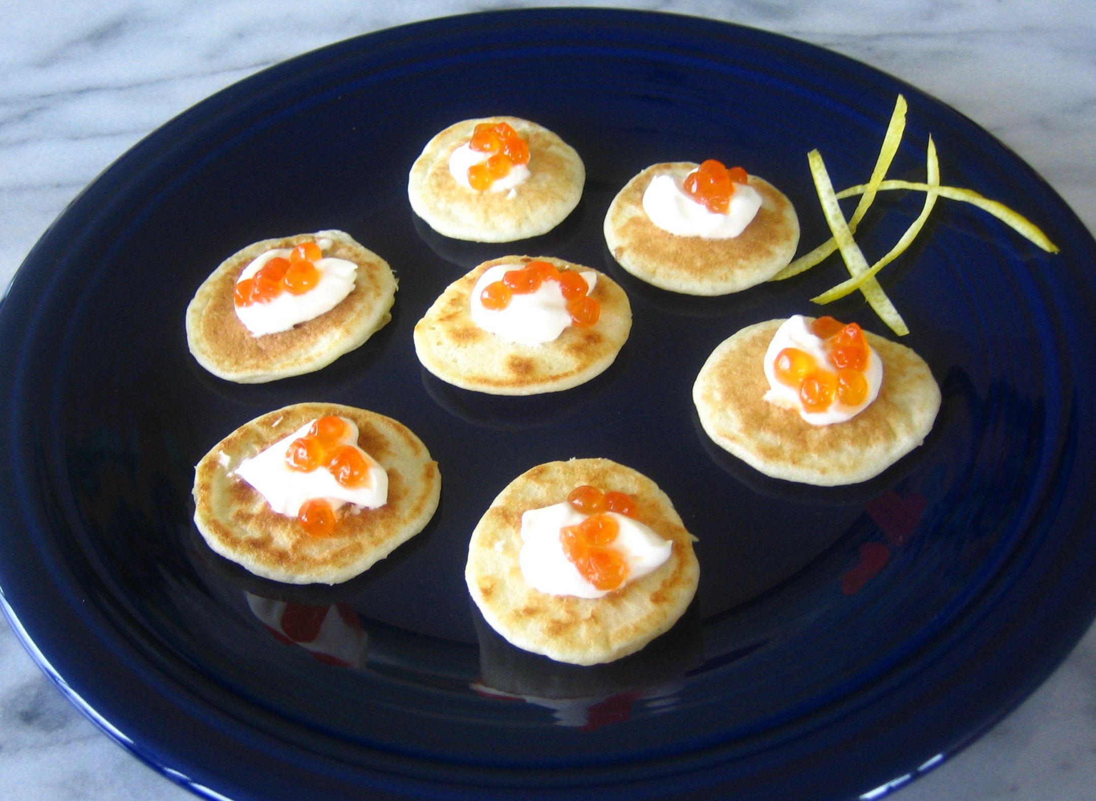 Heat a heavy skillet and brush with butter. Drop teaspoonfuls of batter into hot pan. Turn when first side is lightly browned and cook briefly on second side. Arrange on a platter and top with a small spoonful of crème fraiche and a sprinkling of salmon caviar. Garnish with parsley or dill.