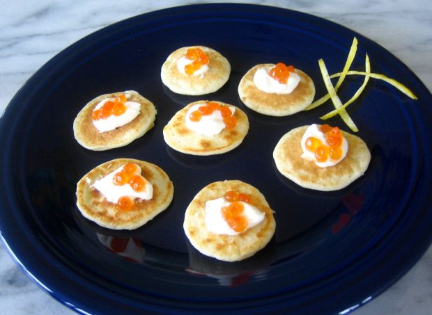 The recipe may look a little complicated, but you can prepare the blinis in advance and reheat them. They also freeze well. But if you really don’t want to make them, I would suggest that you talk to a caterer in your area and ask if they could make them for you, either already topped with the crème fraiche and caviar, or plain so you can add your own toppings.