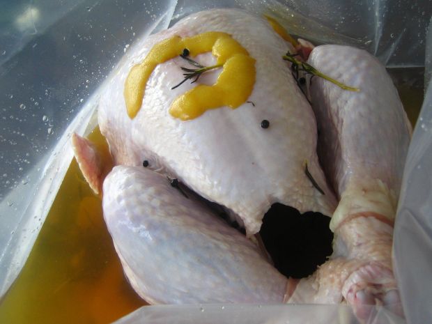 This year, I checked out some food blogs for ideas and landed on Pioneer Woman, a very good read and a brine recipe that said ‘Turkey 2011’ to me. I bought a small (about 13 lbs.) fresh free-range bird and brined it for 24 hours. The turkey was incredibly moist and tasty, even though we could not discern the individual flavours from the brine. Here is the poor thing in the brining bag: