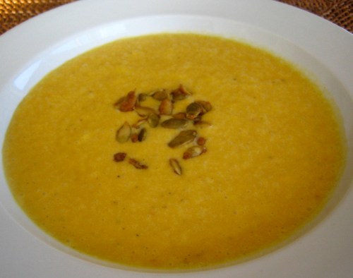 Pour the soup into bowls and garnish with candied pumpkin seeds.