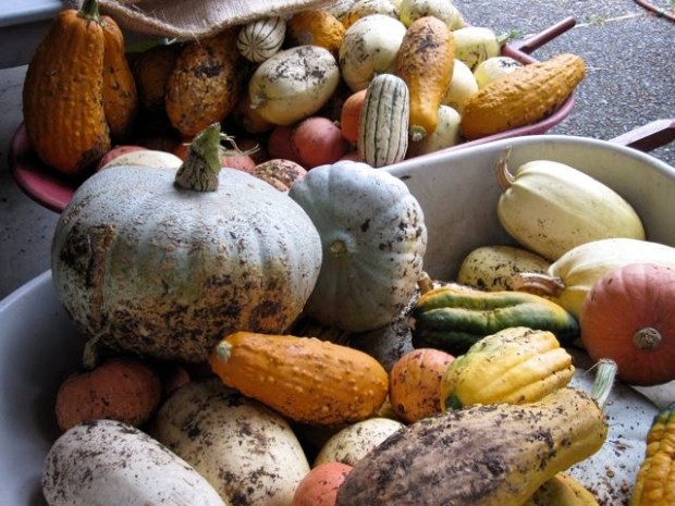My friend, Mackie, is a natural cook, with the ability to put together whatever ingredients happen to be on hand, instinctively and without a recipe. Yesterday, knowing how I am welcoming reader ideas to this site, she was describing her squash dilemma to me in her off-hand and humorous way and I persuaded her to share it here. So, here is Mackie’s story and recipe, and a photograph of an array of squashes from the 2-acre permaculture garden of her son, Eli, and his partner, Christy, who live near Bellingham. More on Eli and Christy’s creative enterprise below.