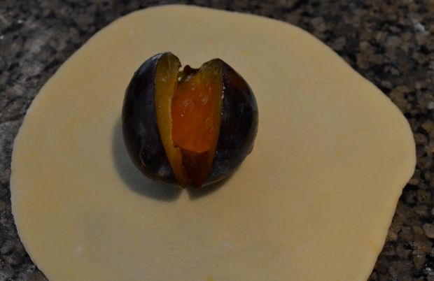 Wash and pit the plums, leaving them in one piece, and fill with 1/2 – 1 teaspoon of apricot jam. Cut off 2″ pieces of dough, roll each into a ball, and then on a lightly-floured surface roll them into about a 4″ circle, about 1/3″ thick. Place the plum in the centre, bring the edges of the dough around it, and seal it well by pinching the dough together. Cut off any excess dough and place them, seam side down, in a large, buttered baking pan.