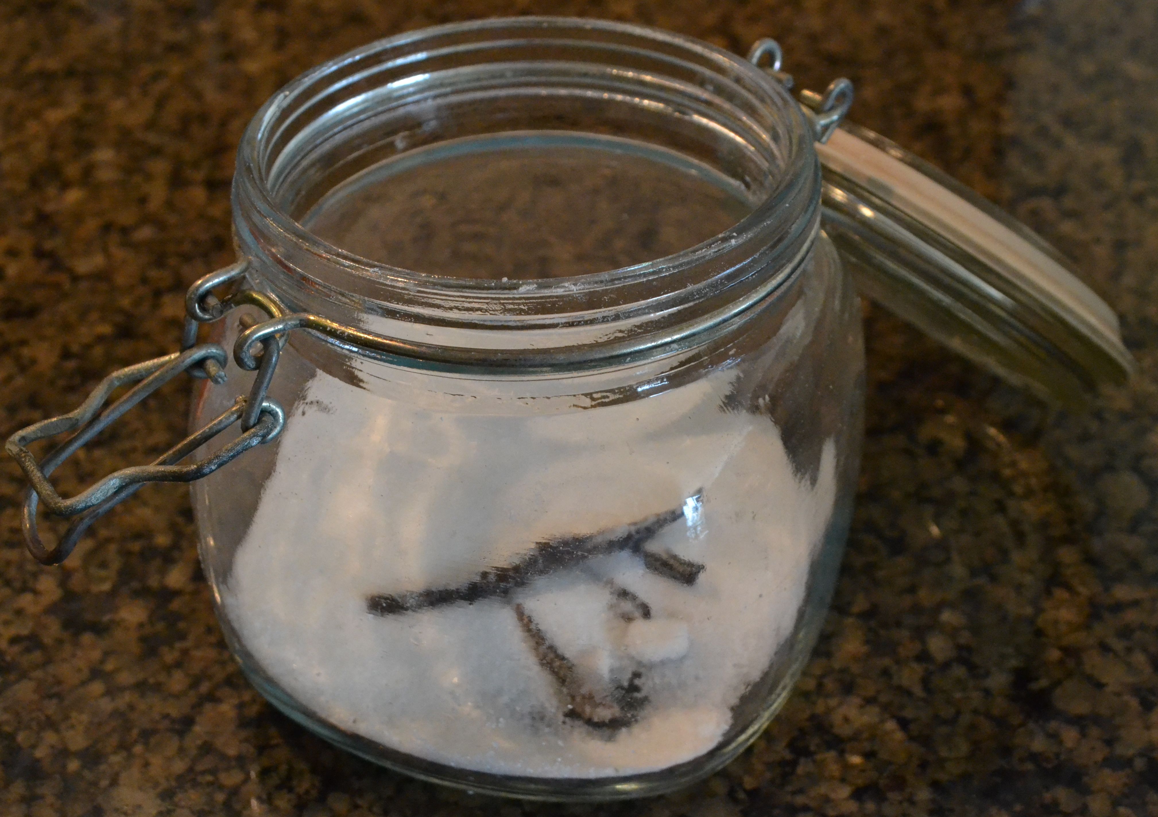 Note: The vanilla sugar that the recipe calls for can be easily made and kept on hand. Cut a vanilla pod in half lengthwise and bury it in a container of sugar. You can also use a pod from which you have already removed the seeds for something else, as you can see that I have done in the photo below. This will keep for a very long time, and the vanilla flavour will intensify. If you do not have any vanilla sugar for the buchty, you can just use regular sugar.