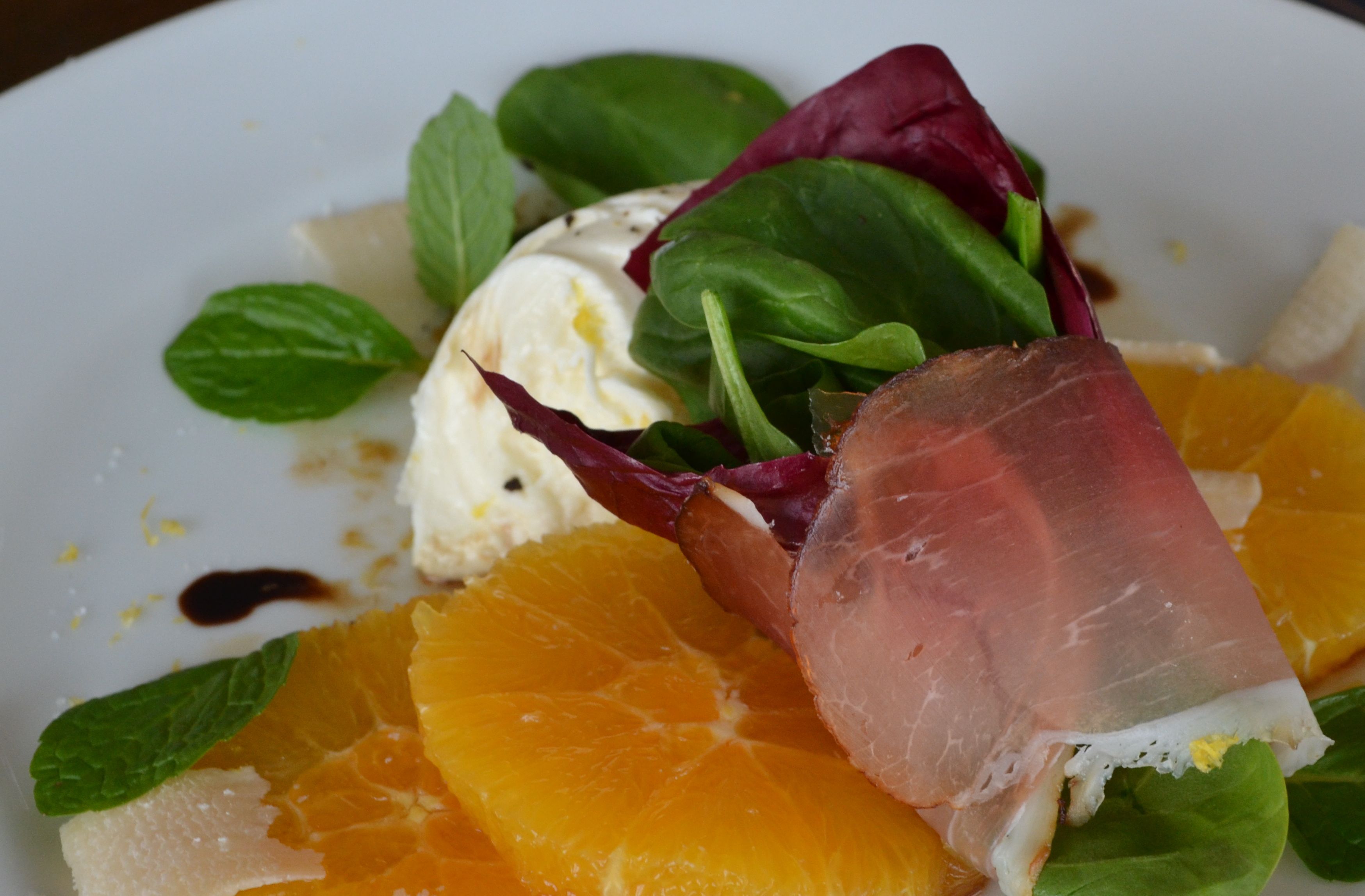 On each of six individual plates, place one chunk of torn mozzarella. Sprinkle with salt and pepper and grate lemon zest over top. Arrange 3 orange slices, slightly overlapping the cheese. In a separate bowl, toss the spinach, raddichio and half of the mint with some lemon dressing. The dressing should be quite tart, so use sparingly. Roll 6 small portions of the greens in slices of speck and lay this decoratively on top of the fruit and cheese. There will be greens remaining which should now be arranged on each plate. Top with shaved parmesan and sprinkle very lightly with balsamic vinegar.