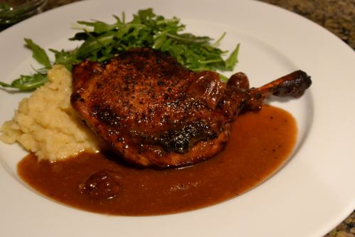 Preheat oven to 350°F.Trim duck legs of excess fat, prick with a fork all over and season with Kosher salt and freshly ground pepper. In a covered baking pan that is just large enough to hold the legs in one layer, make a bed for the duck with the garlic, thyme and 1/2 c. of the cherries. Place duck legs over top. Boil the stock and pour it over top so that the level of liquid comes just below the surface of the duck. Cover and braise in the oven for 1 1/2 hours. Remove from the oven. Lift out the duck, place it on a baking sheet, cool slightly,  cover with plastic wrap and refrigerate until ready to finish.