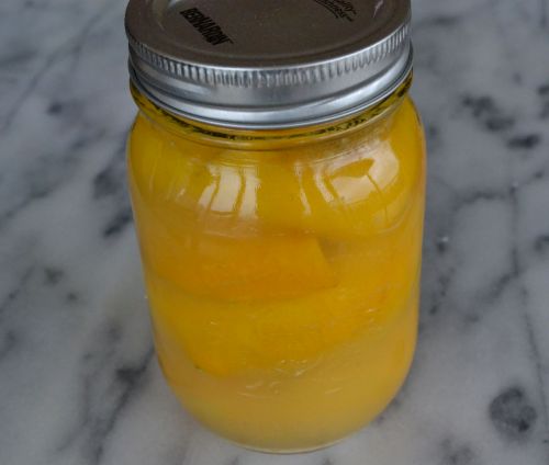 Pack about 1 T.Kosher salt into each lemon and put them into a clean, glass jar with a tight-fitting lid. I used a 500ml. (2 c.) jar which fit 4 lemons. Press them in firmly so that they release some of their juices. Make sure that the lemons are covered with juice, adding more squeezed juice if necessary. Screw on the lid and keep them on the kitchen counter, turning the jar upside down every once in a while to mix the salt and juice. You can keep them on the counter for one month (the better to admire them!) then put them into the refrigerator and use them as needed.