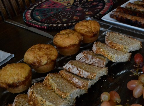 Brunch has increasingly become a favoured family/friends meal in our household. It seems to suit the schedules of all generations who gather around our table these days. Planned ahead, much of the preparation for this menu can be started in advance: fruit salad the night before; bread and muffin ingredients measured in advance, then finished and baked quickly in the morning;  and yes, even the soufflés can be baked for the first time the day before, then refrigerated and finished just before serving.