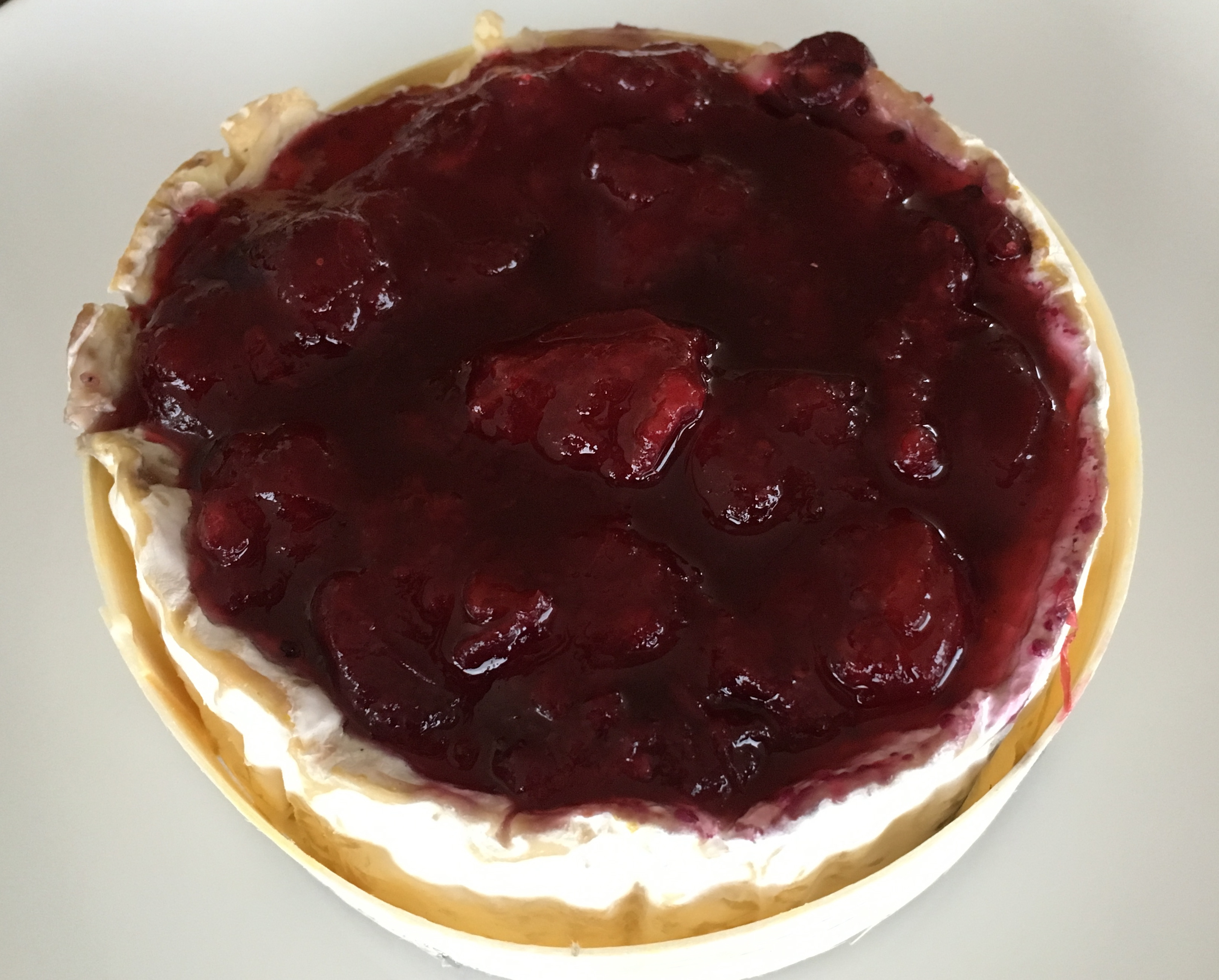 Preheat oven to 400ºF. Remove the lid and wrapping of a 4-5” round of Camembert and place the cheese in the bottom part of the container on an oven-proof baking sheet. Place in oven and bake until the cheese starts to warm and soften. Remove it from the oven and spoon some cranberry sauce over the top. Put back in the oven and cook until hot. Transfer cheese to a serving tray and serve with bread or crackers.