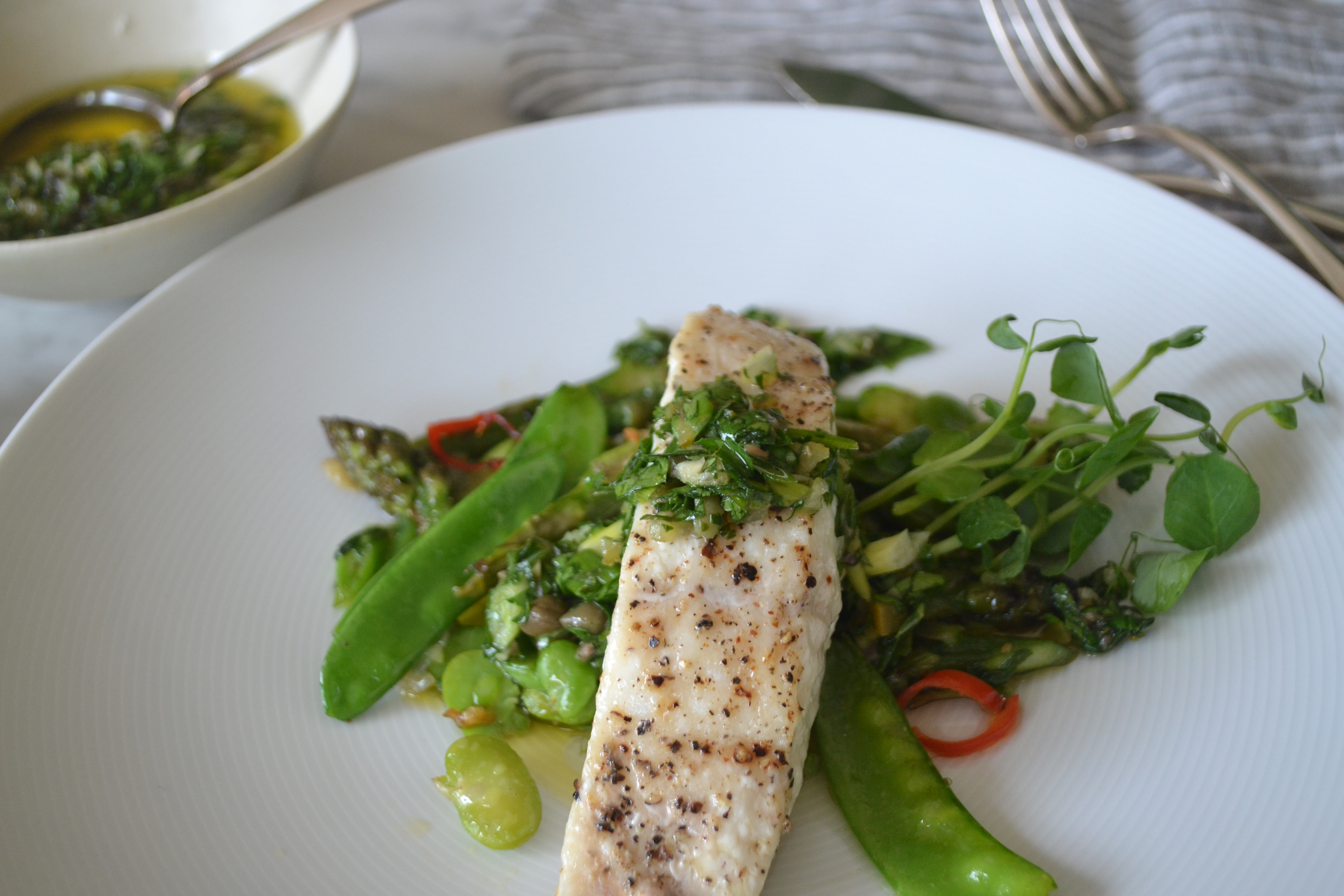 Preheat oven to 400ºF. Season lingcod with salt and pepper. Heat olive oil in a heavy sauté or grill pan over high heat. Add the fish and brown well on one side, about 5 minutes. Turn fish, place in the oven and roast until just done, about 3-5 minutes, depending on thickness. Fish is done when just opaque. If using salmon, leave the skin on and sear and roast as described, starting with the skin side down. Plate with skin side up.