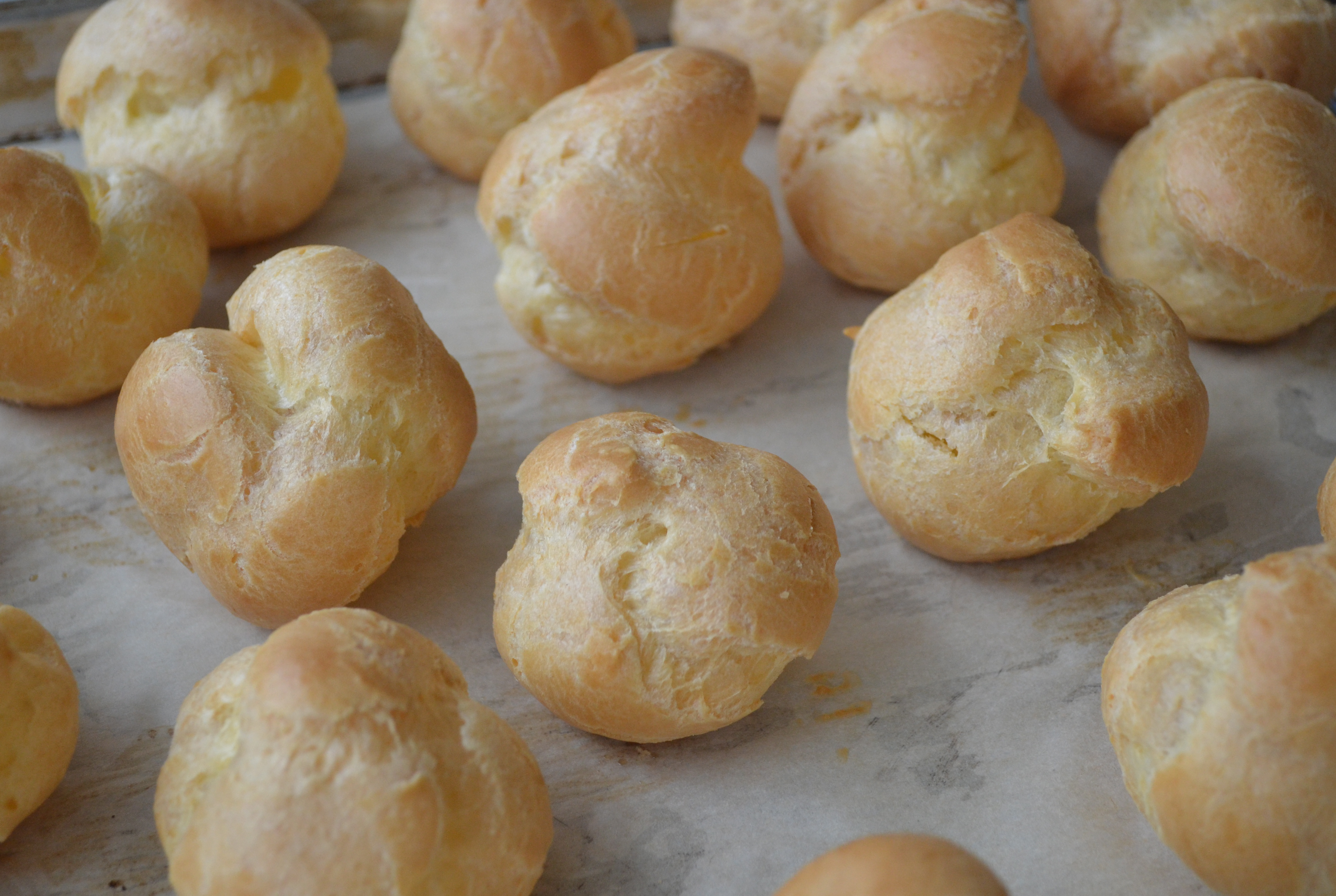 Preheat oven to 400ºF. Place the water, butter and salt in a medium saucepan and bring to a boil. Take the pan off the heat and add flour all at once. Stir vigorously with a wooden spoon, until the dough is smooth, pulls away from the sides of the pan and begins to form a ball. Return to a moderate heat and keep stirring to dry out the mixture slightly, for about 1-2 minutes. Remove from the heat and cool dough for about 5 minutes. Beat in the eggs one at a time and stir until smooth and glossy. The mixing is made much easier if you have food processor. Put the dough into the bowl of the processor and add the eggs one at a time, processing until the dough is smooth.