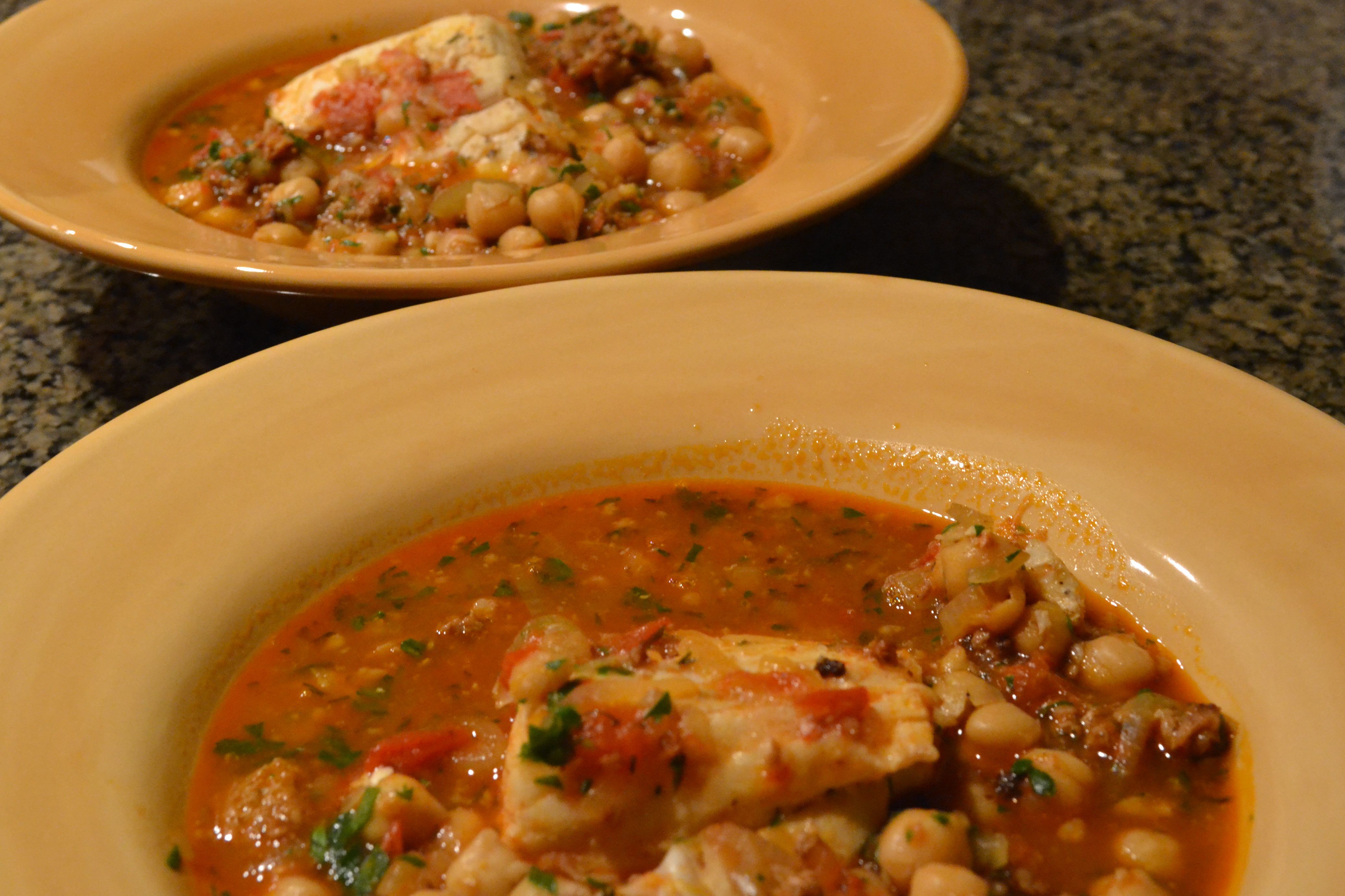 Braising is one-pot cooking at its finest and this halibut dish is a simple and comforting way to usher in February in Vancouver. While I would not normally buy halibut out of season, I found this recipe online at redonline and decided to test it with halibut fillets. The combination of smokey, spicy chorizo sausage, garbanzo beans (the original recipe called for chickpeas which are similar but smaller), and tomatoes, produces a deep and complex flavour that would complement many less expensive types of fish and chicken too. We ate this with a crunchy baguette to dip into the sauce.